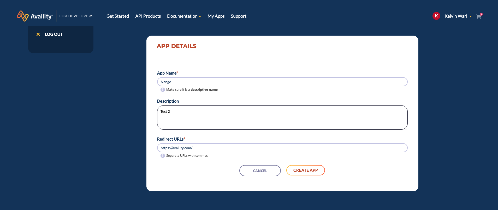 1. Enter your application details (name, description, etc.), and then select Create App.