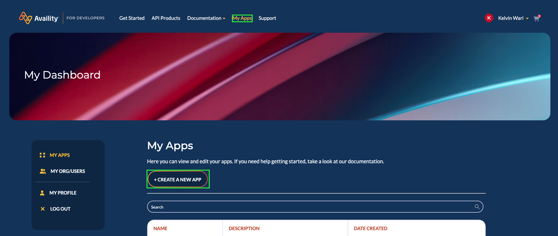 2. Select My Apps in the menu bar, then select Create a New App.