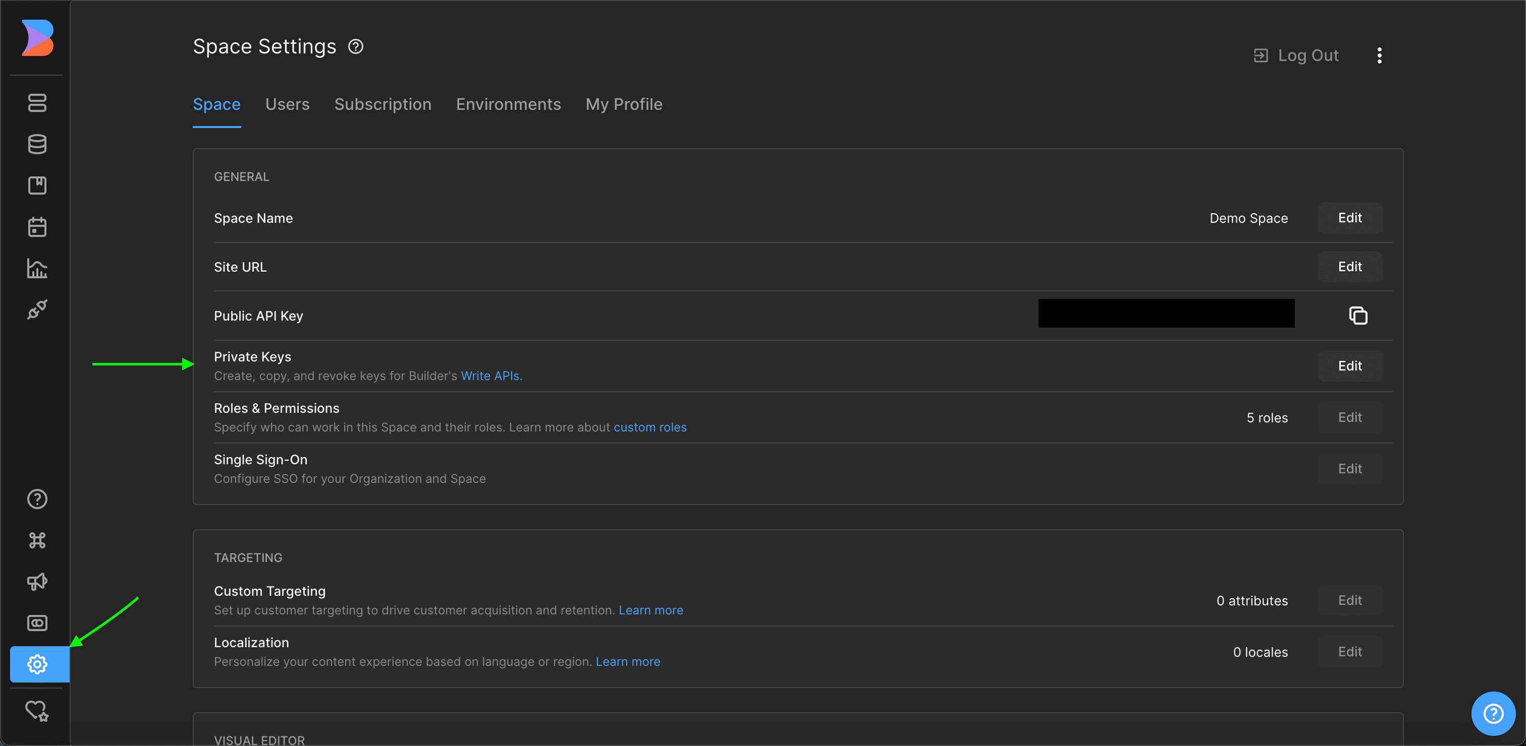 3. Under Space Settings, find Private Keys and click Edit.