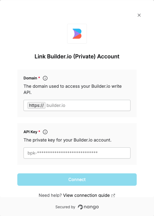 1. API Key – A private key that grants Nango permission to use Builder.io’s Write API.