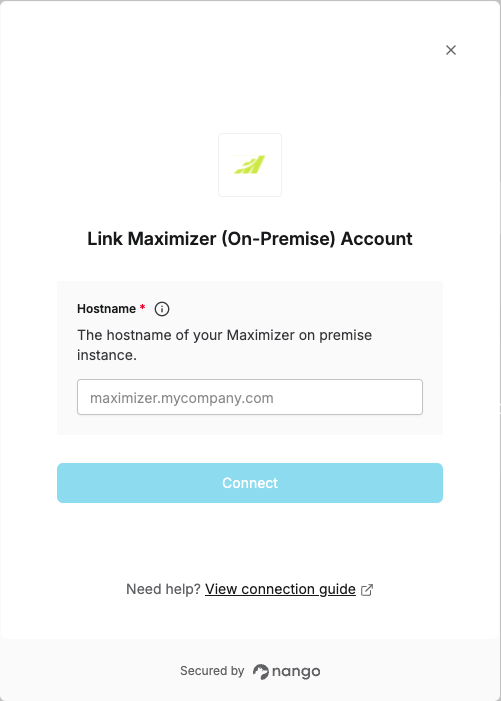 To authenticate with Maximizer (On-Premise), you will need:- Hostname - The hostname of your Maximizer on premise instance