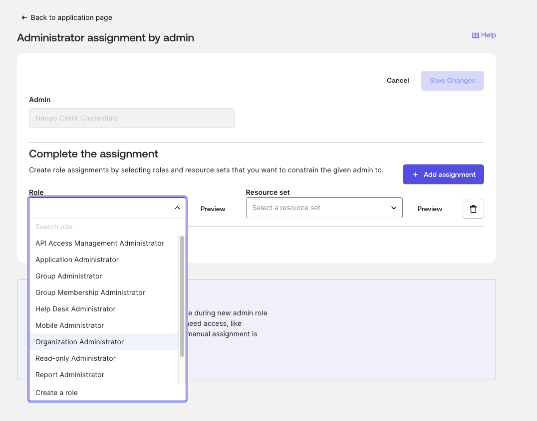 1. In the Admin Console, navigate to Security > Administrators (or go to Applications > Applications > your app > Admin roles).