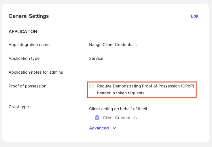 1. Disable Proof of possession (DPoP) — it is not supported by Nango.