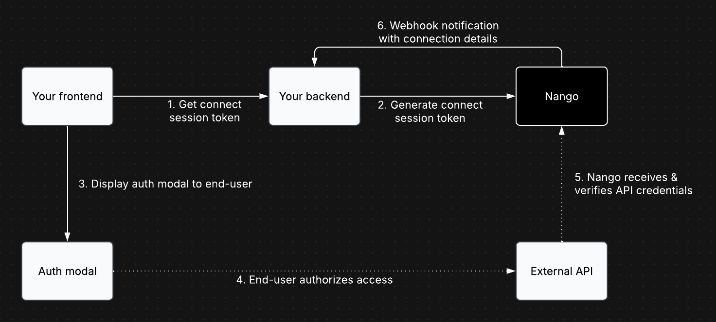 In your backend, set up an API endpoint that your frontend will call before each authorization attempt to retrieve a session token from Nango. Here’s an example of how your backend can retrieve a session token from Nango (API / Node SDK references):- Node
