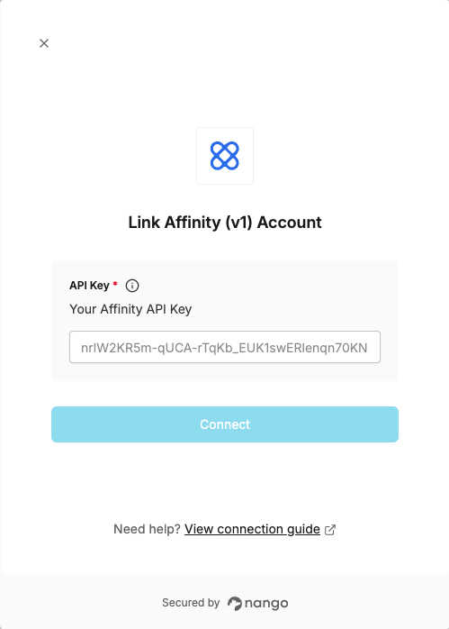 To authenticate with Affinity (v1), you will need:- API Key - A key that grants Nango permission to interact with Affinity’s v1 API resources and services.