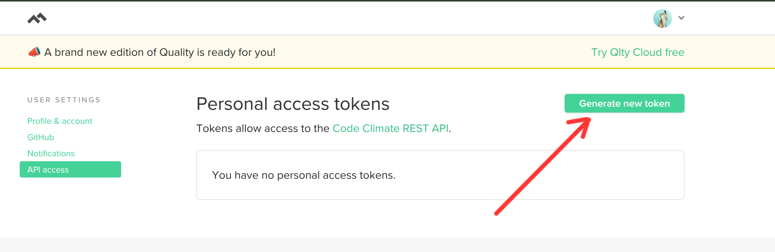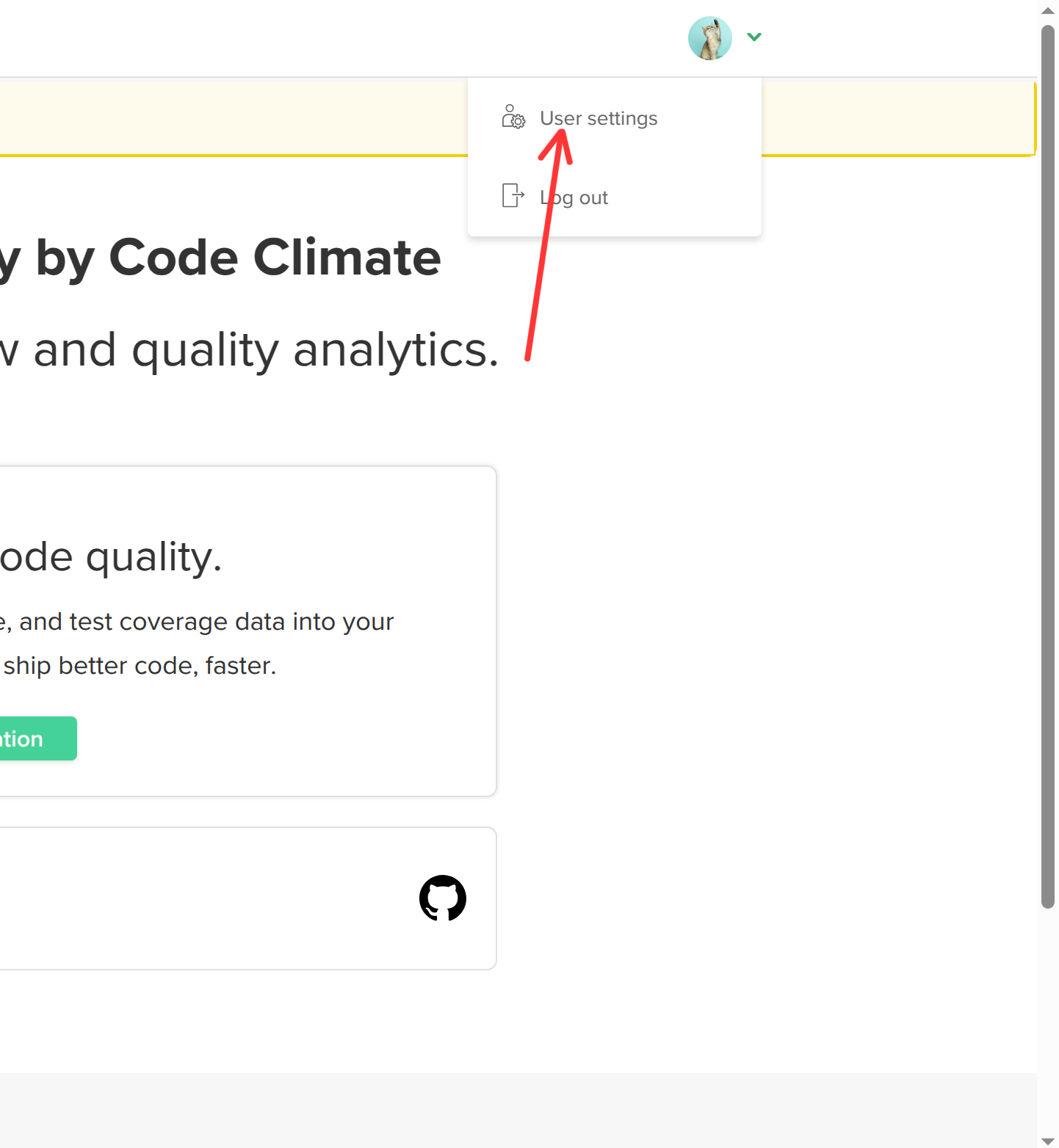 - From your Code Climate dashboard, hover over your profile icon in the top right corner. Click on User Settings.