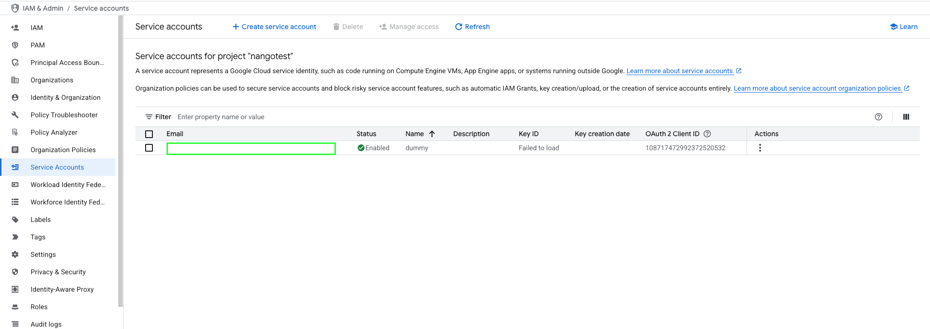 1. From the Service accounts page, click the Email address of the service account you created.