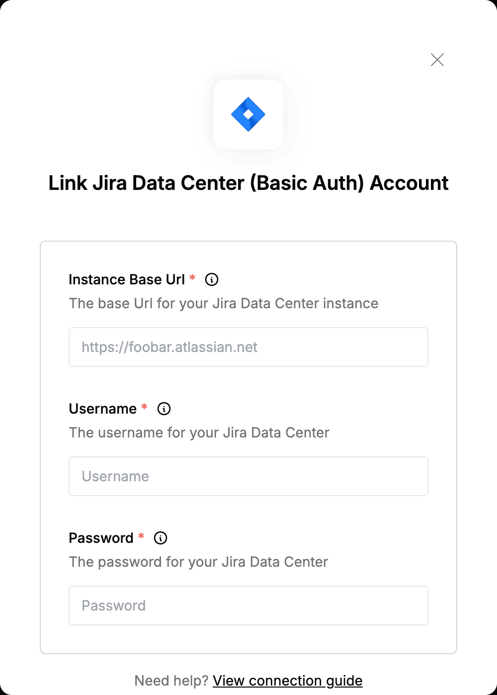 To authenticate with Jira Data Center (Basic Auth), you will need:- Instance Base Url - The root URL of your Jira Data Center instance.