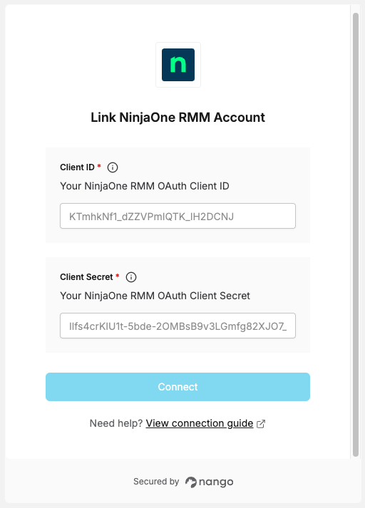 To authenticate with NinjaOne RMM, you need:- Client ID – Your OAuth application’s Client ID