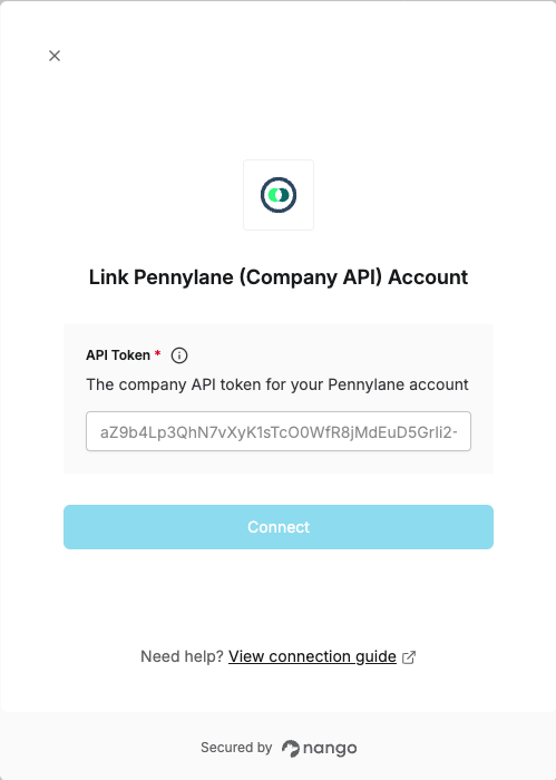 1. API Token - A token that grants Nango permission to interact with Pennylane’s API resources and services.