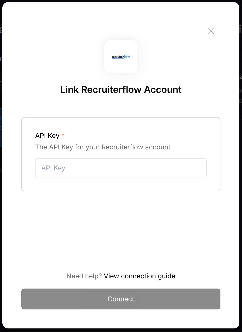 Generating an API key requires contacting Recruiterflow support.Step 2: Enter credentials in the Connect UI