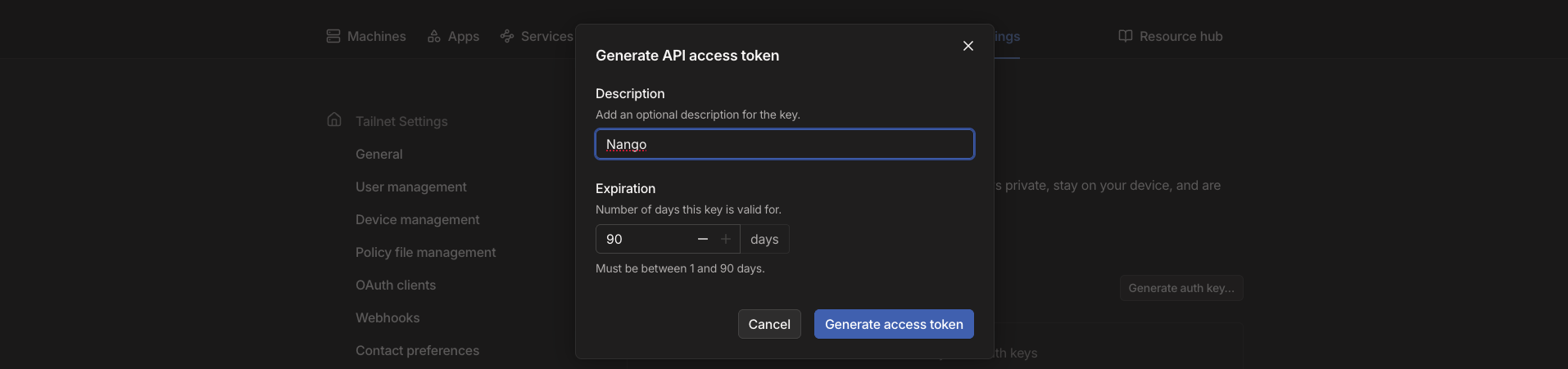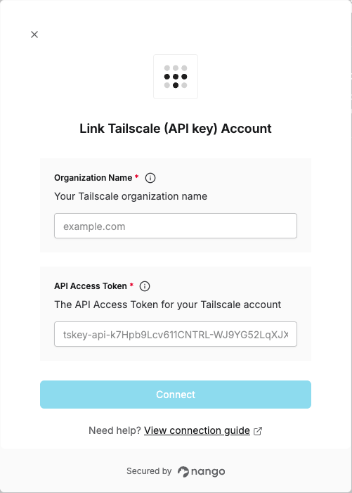 - API Access Token - A key that grants Nango permission to interact with Tailscale’s API resources and services.